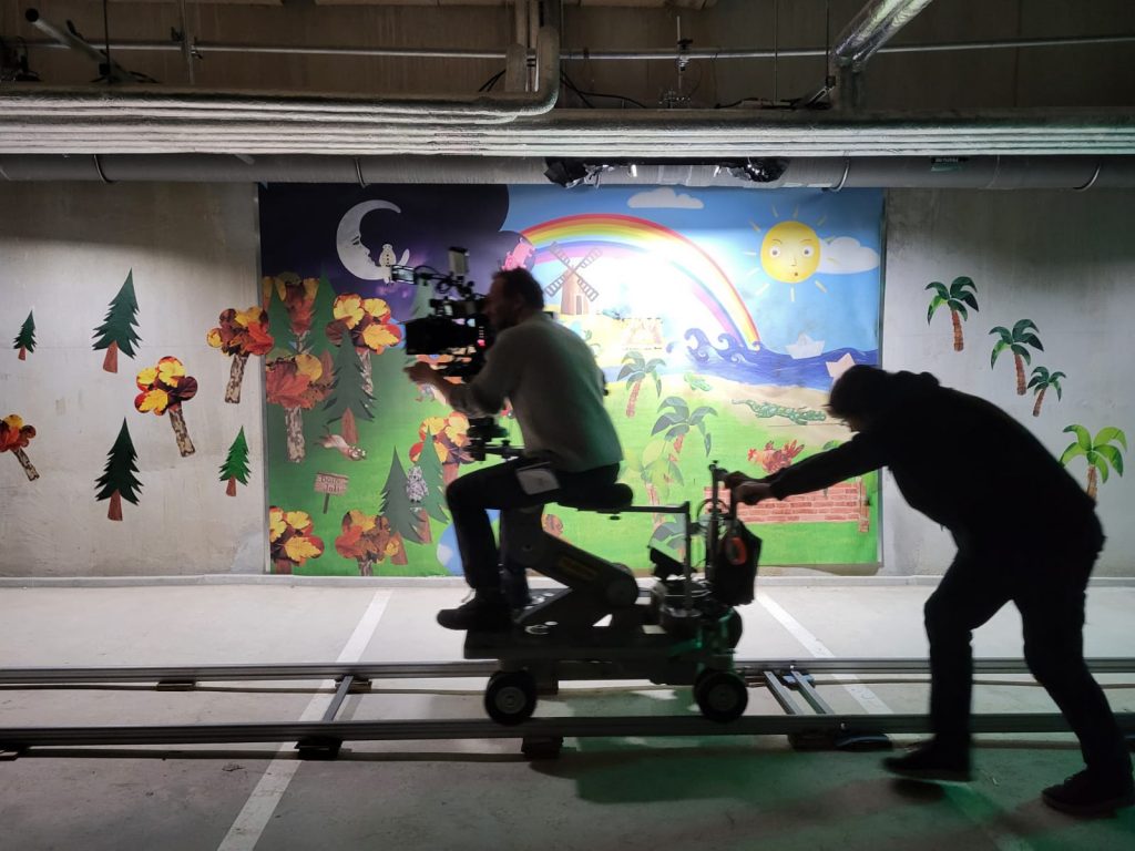 […] C’était très facile de déplacer la caméra dans ce décor, parce que nous tournions avec une Dolly (support de caméra sur roues ou rails permettant de réaliser, lors d’une prise de vues cinématographique, un travelling sans à-coups). C’était un autre parti pris du film : Ne pas tourner avec un steadycam. Quasiment tous les déplacements sont des déplacements « à l’ancienne ».
