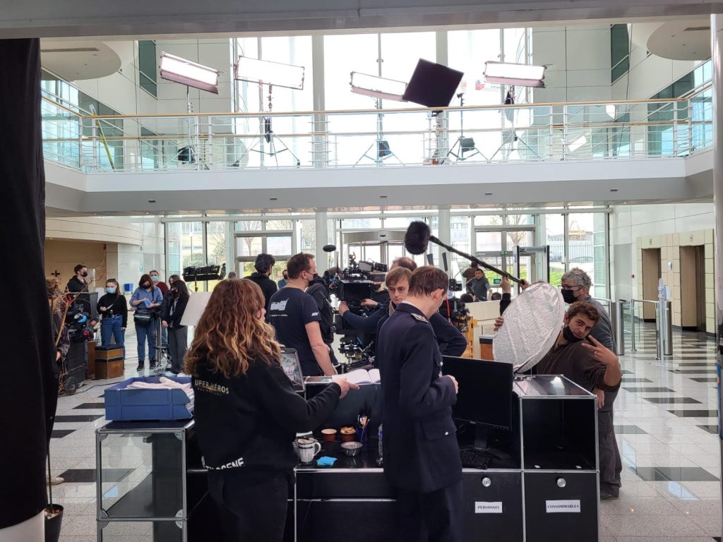 […] Autre difficulté : pour l’accueil du commissariat, il y avait d’immenses baies vitrées. On a tourné toute la journée et, évidemment, le soleil change. Entre sa course et les nuages, c’était un vrai casse-tête pour les raccords. J’avais une grosse quantité de projecteurs pour rattraper quand je pouvais mais on ne peut pas battre le soleil. Il fallait donc travailler les axes par rapport à la position du soleil. Autre complication : Il y avait un éclairage automatique dans le hall, d’un orange affreux. Et évidemment il se déclenchait de manière aléatoire. Nous avons mis du temps à comprendre le pourquoi du comment : il y avait des capteurs solaires un peu fatigués qui se déclenchaient dès qu’un gros nuage couvrait le soleil. Cela m’a créé quelques faux raccords mais qui ne se voit pas trop heureusement (si vous avez l’œil, regardez bien le réceptionniste. Derrière lui, vous verrez des petites loupiottes orange qui s’allument).
