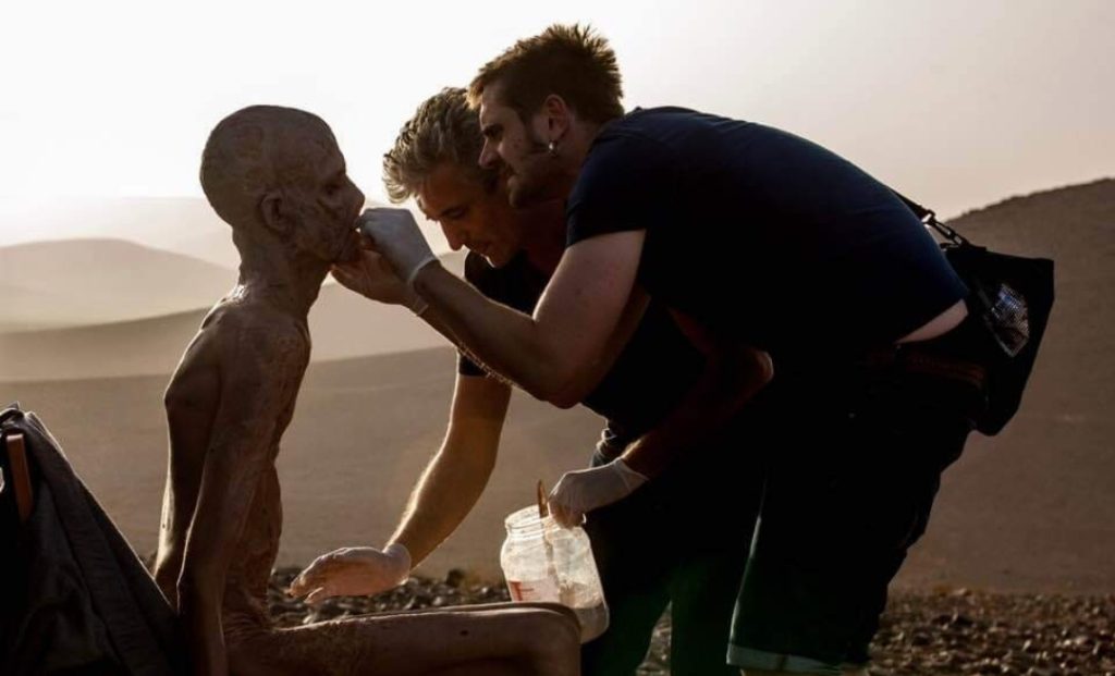 Nous avions travaillé le visage avec des prothèses silicone qui étaient bien rangées dans des caisses sur le tournage, et des grandes plaques de prothèses transferts, qui sont des moules en silicone dans lequel on étale de la Pros-aide cream, une sorte de colle en pâte qui permet de créer une prothèse auto-collante. Chaque soir, avec mon assistant, Pierre Parry, nous faisions des tirages avec notre colle. Dans la nuit, alors qu’il ne pleut quasiment jamais dans le désert marocain, une grosse averse est tombée. Pour protéger les prothèses, les gens sur place avaient mis des sacs poubelles par-dessus, ce qui ne fallait surtout pas faire (rire). Quand nous sommes arrivés, les sacs poubelles étaient collés sur les prothèses. Heureusement, ce fut sur notre seul jour de repos, et nous avons pu les refaire pour le tournage du lendemain.