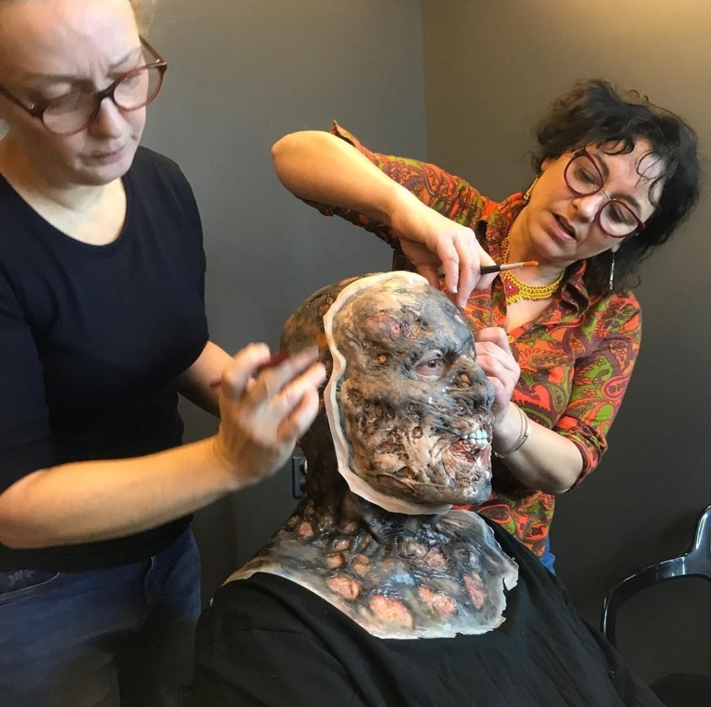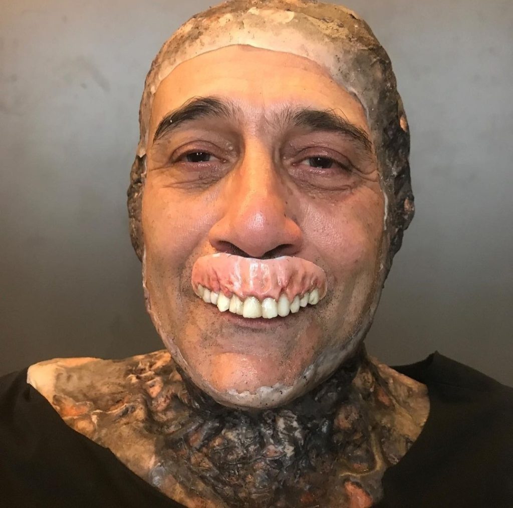 Tout est pré-peint en atelier. Ce sont des encres à l’aérographe qui sont fixées avec des vernis silicone. Une fois que c’est collé sur le comédien, nous nous occupons sur le tournage des raccords. Ce personnage avait aussi des prothèses dentaires qui étaient collées à l’extérieur de sa bouche, une espèce de dentition apparente un peu comme les zombies dans « The Walking Dead ». Ensuite, nous posions le masque par-dessus, avec un trou autour de la bouche pour avoir la sensation que les lèvres ont fondu.