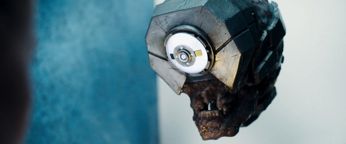 Je ne suis pas un grand dessinateur, mais j’ai proposé des idées avant de passer à la sculpture que j’ai réalisée sur un buste en plâtre de l’acteur, afin de pouvoir ensuite faire des moulages et tirer les prothèses en silicone. Nous avions un masque en deux parties qui pouvait s’appliquer sur le comédien puis, un dégradé qui partait du bas du visage qui s’étalait un peu sur son corps pour créer des sortes de plaques de brûlures. Nous n’avions peu de re-sculptures de son corps à réaliser puisqu’il a cette morphologie très particulière avec des os saillants que nous n’avions pas besoin de reproduire en prothèses. […] Le but n’était pas de le transformer totalement en monstre, c’est aussi une victime de cette guerre apocalyptique. Il fallait qu’il conserve des aspects humains, des réminiscences de sa vie antérieure. C’est un peu la belle et la bête à la fin du film.
