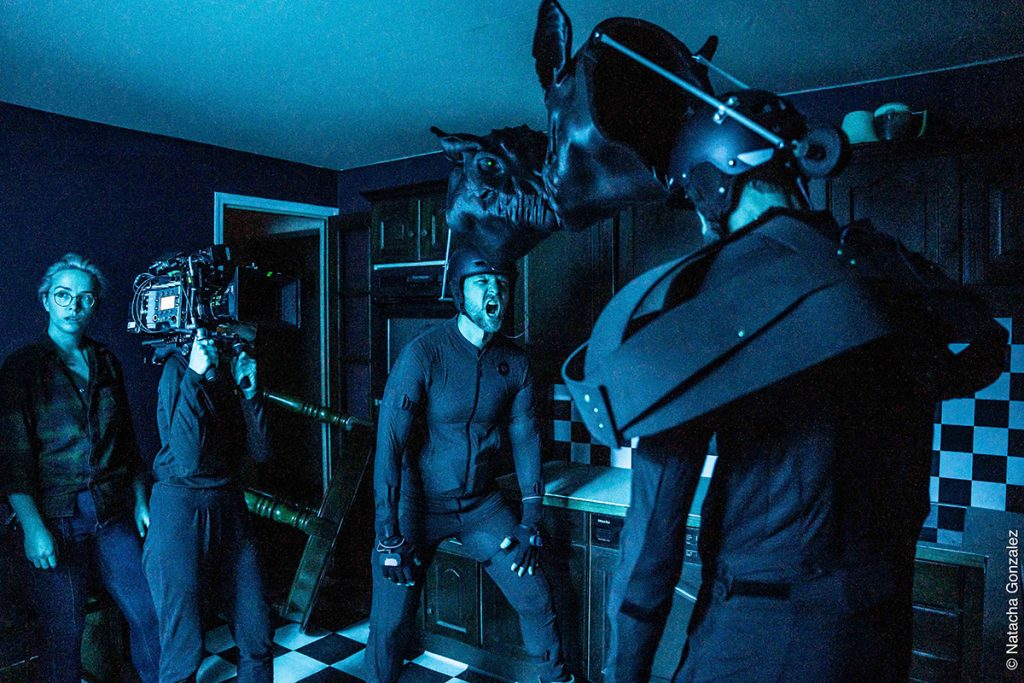 Nous avons également fait des tests filmés sur le décor avec les comédiens en tenues de motion capture pour tester les combinaisons puis le rendu des monstres en 3D dans le décor réel. […] Sur le tournage, les comédiens qui jouaient les monstres (Pierre Rochefort et Fabien Houssaye) étaient en combinaison de motion capture, et ils avaient aussi une tige accrochée au dos avec une tête de monstre fixée dessus, imprimée en 3D par le studio. Cela nous permettait d’avoir la bonne hauteur pour cadrer les monstres et caler la lumière. Ensuite, nous faisions une passe à vide sans les comédiens et c’est sur cette passe à vide qu’ont été incrustés les monstres en post-production. Cela a fait gagner beaucoup de temps en animation au studio et nous a permis d’avoir des effets spéciaux plus réalistes.