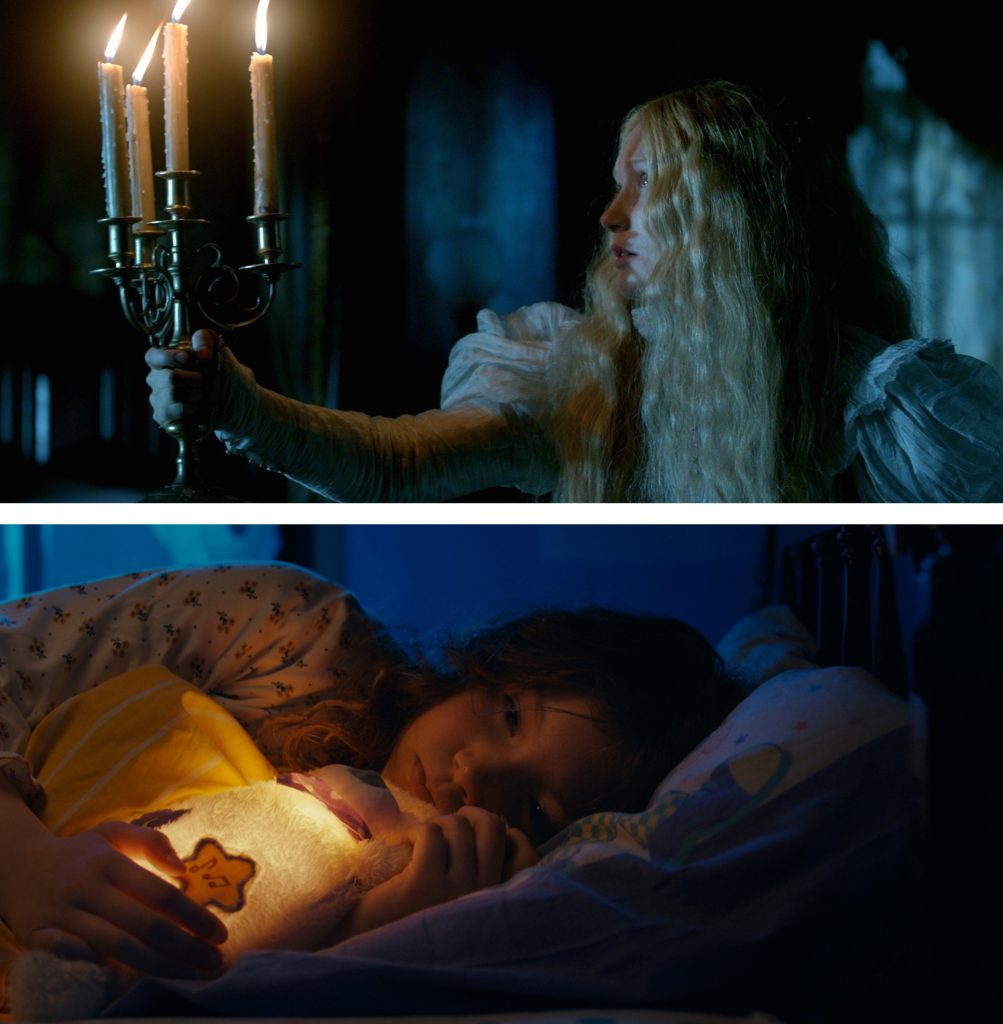 Les films de Guillermo Del Toro sont une grande source d’inspiration ! Notamment sa lumière et ses associations de couleurs. Nous avions d’ailleurs en référence une des images du film « Crimson Peak », dans laquelle l’héroïne avance dans un couloir, éclairée par la lumière orangée de son chandelier, avec une lumière bleue nuit en fond. Ada, elle, se déplace avec un doudou lumineux, qui éclaire son visage, avec la lumière bleue de la nuit derrière elle. Pour la déco, nous avons entièrement redécoré la maison de mes grands-parents à Montreuil, parce que nous n’avions pas trouvé de maison dans notre budget qui acceptait qu’on la re-décore entièrement. Plusieurs semaines ont été nécessaires pour tout retaper. L’idée de la déco était de créer une atmosphère étrange, oppressante, sans pour autant que l’on s’en rende compte immédiatement. Cela afin de plonger progressivement les spectateurs dans l’univers fantastique du film. Toutes les pièces ont donc été retravaillées dans cette direction. Il n’y a pas un accessoire qui ait été laissé au hasard. La cheffe déco, Alexia Merré, et toute son équipe ont fait un travail énorme pour donner vie à cette maison et qu’elle ait une atmosphère unique.