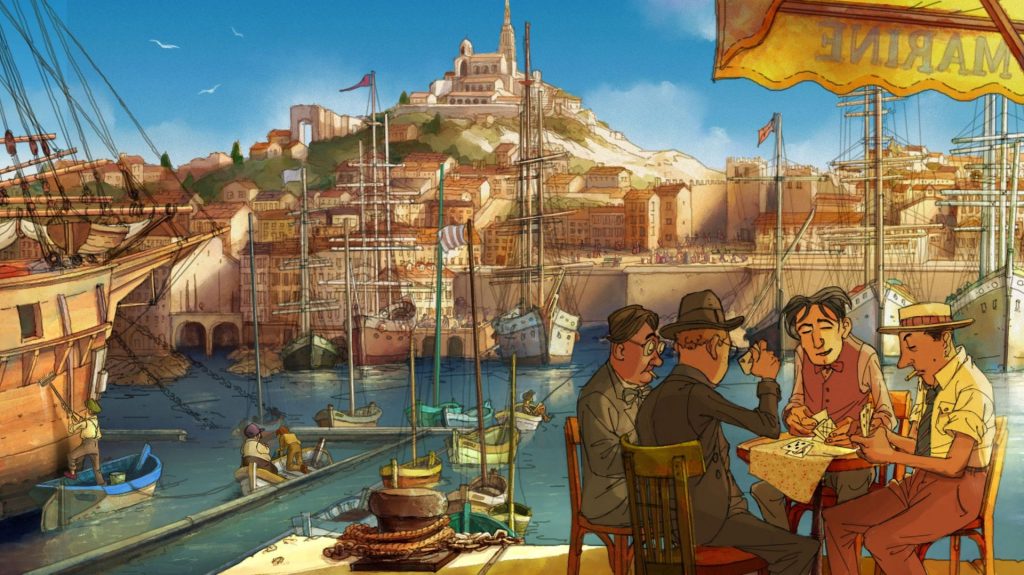 Alors, c’est très simple, j’avais déjà les deux villes dans Les Triplettes de Belleville. Le début des Triplettes se passe à Paris, donc j’avais déjà ces couleurs un peu typiques parisiennes : des verts chauds, des bleus chaleureux. Et j’avais aussi une scène à Marseille, en plein été, dans des tons très chauds, orangés, très jaunes. Je ne voulais pas refaire exactement la même chose, mais j’ai utilisé les mêmes procédés, justement pour bien marquer la différence entre les deux univers.
