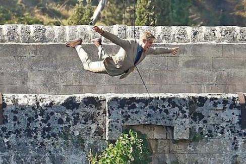 La seconde, c’était : comment le faire sortir de là ? J’ai imaginé qu’il pourrait y avoir des câbles électriques à haute tension attachés au pont. Daniel en attrape un, l’arrache, se jette dans le vide et le câble freine sa chute. Il tombe de 7-8 mètres, passe sous le pont et s’échappe. Nous avons répété cette chute. C’était difficile, car il fallait trouver des grues suffisamment solides. Le sol étant fragile, nous avons dû faire des études de terrain pour nous assurer que l’on pouvait installer deux grues afin de sécuriser Daniel et les cascadeurs. On a dû effectuer une trentaine de sauts avec un cascadeur pour vérifier le poids, la distance, la trajectoire… Il y avait le moment du saut, celui de la chute, celui où il lâche le câble, puis l’atterrissage. Tout cela a pris énormément de temps.